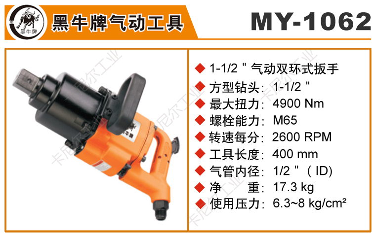 1.如阁下对MY-1062黑牛1-1/2"气动双环式扳手(风炮)价格和使用方法等有需求时,我们的客服人员将为阁下找到解决MY-1062黑牛1-1/2"气动双环式扳手(风炮)问题的方法。