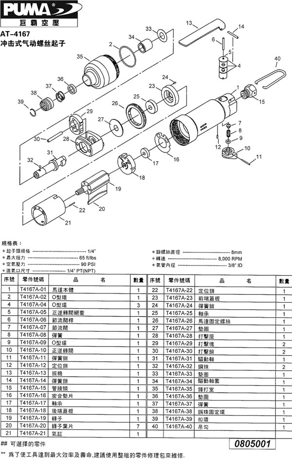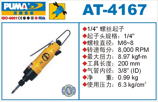 1.如阁下对AT-4167巨霸气动螺丝起子(风批)价格和使用方法等有需求时,我们的客服人员将为阁下找到解决AT-4167巨霸气动螺丝起子(风批)问题的方法。