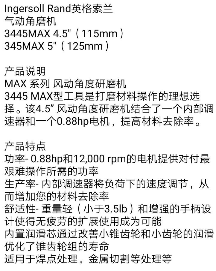 英格索兰 3445MAX 4-1/2" 气动低速轮胎软擦器产品详细说明