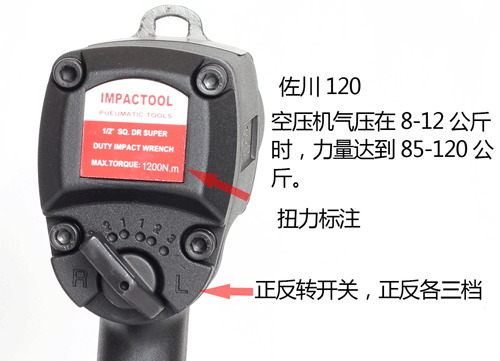 气压在0.8mpa时约85公斤扭力即850牛.米,当气压提升到1.2mpa的时候,最大扭力会达到120公斤即1200牛.米,同时请一定要配8-10内径的气管。