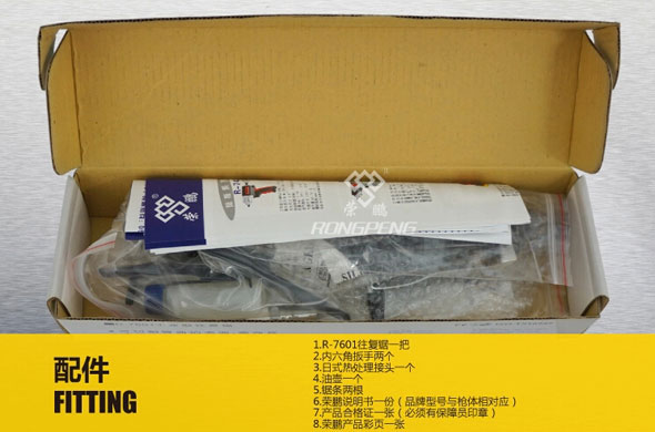 3.我们将对R-7601荣鹏气动工具气动往复锯提供免费送检,阁下在签收快递前请详细核查R-7601荣鹏气动工具气动往复锯资料信息。