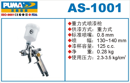 1.如阁下对AS-1001重力式喷漆枪价格和使用方法等有需求时,我们的客服人员将为阁下找到解决AS-1001重力式喷漆枪问题的方法。