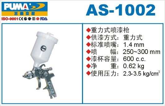1.如阁下对AS-1002重力式喷漆枪价格和使用方法等有需求时,我们的客服人员将为阁下找到解决AS-1002重力式喷漆枪问题的方法。