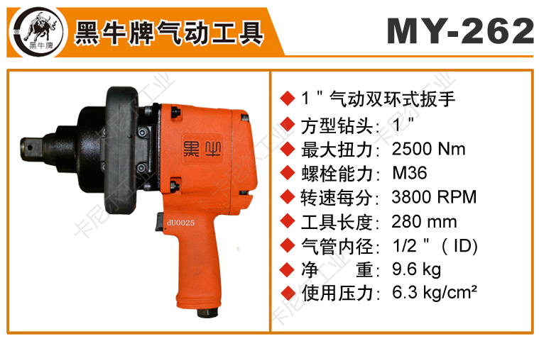 3.我们将对MY-262黑牛1"气动双环式扳手提供免费送检,阁下在签收快递前请详细核查MY-262黑牛1"气动双环式扳手资料信息。