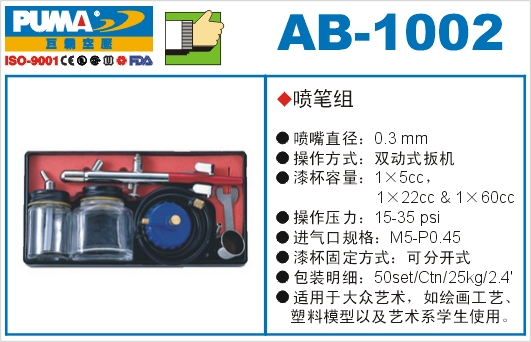 1.如阁下对AB-1002喷笔组价格和使用方法等有需求时,我们的客服人员将为阁下找到解决AB-1002喷笔组问题的方法。