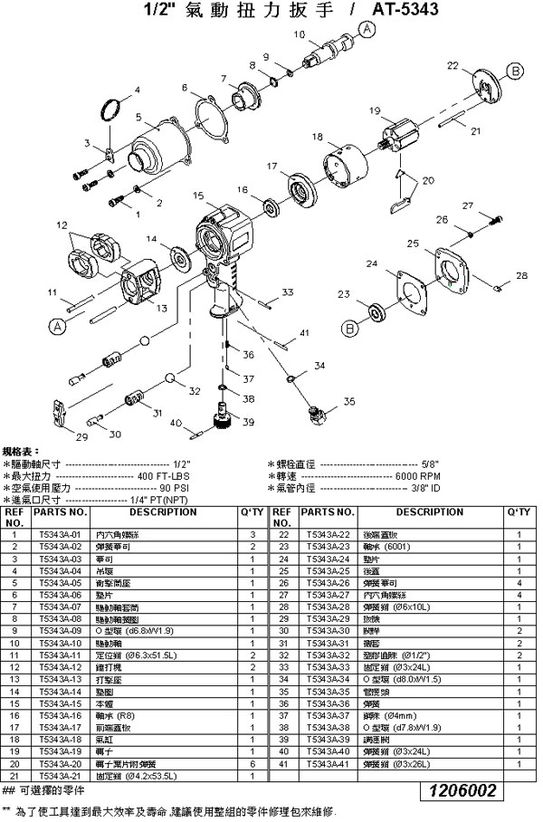 3.我们将对AT-5343巨霸气动扳手提供免费送检,阁下在签收快递前请详细核查AT-5343巨霸气动扳手资料信息。