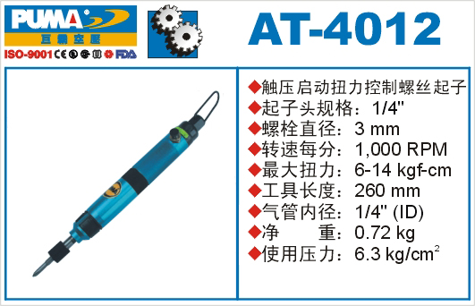 该款AT-4012气动螺丝起子是美国巨霸PUMA集团公司推出的一款可通过触压来启动,并可控制扭力的气动螺丝起子,触压启动设计达到高精度锁紧扭力,所设定之扭力到达时,全部自动停止,直接式扭力调整设计,扭力精准,耗气量少,节约能源实现,低噪音、低振动,广泛应用于高产能、高精度螺丝攻拆,电脑业、仪器、电器等精密工业装配厂