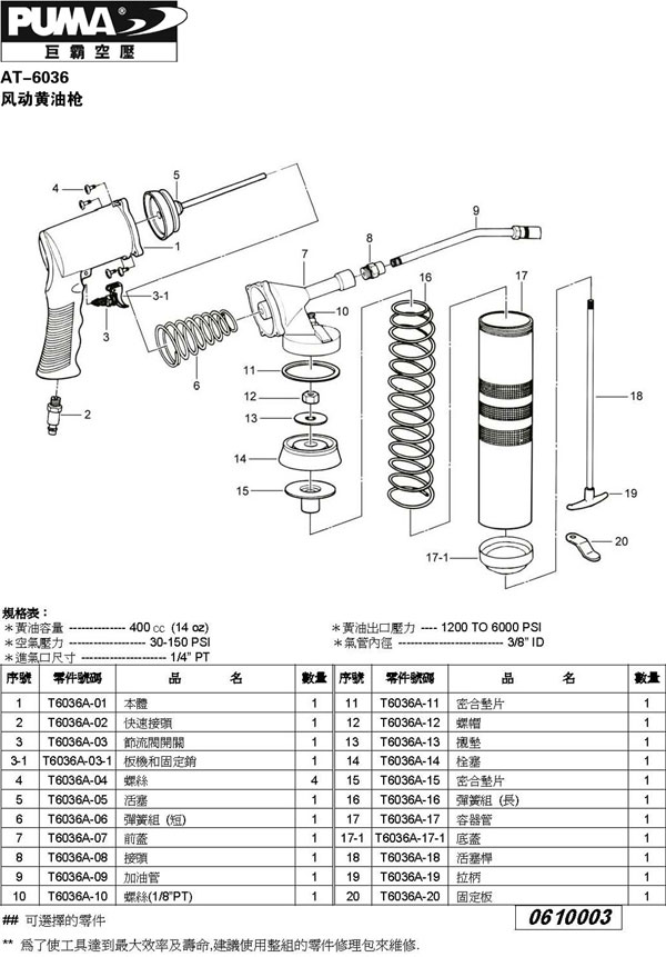 1.如阁下对AT-6036风动黄油枪价格和使用方法等有需求时,我们的客服人员将为阁下找到解决AT-6036风动黄油枪问题的方法。
