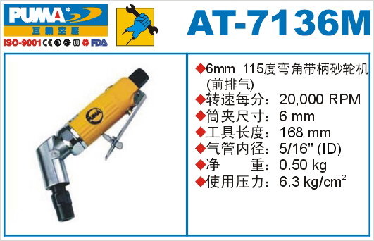 1.如阁下对AT-7136M 6mm 115°弯角带柄砂轮机(前排气)价格和使用方法等有需求时,我们的客服人员将为阁下找到解决AT-7136M 6mm 115°弯角带柄砂轮机(前排气)问题的方法。