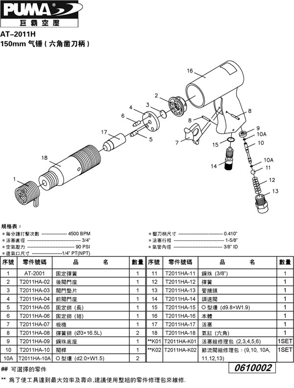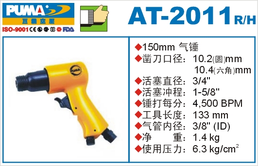 1.如阁下对AT-2011R 150mm气锤价格和使用方法等有需求时,我们的客服人员将为阁下找到解决AT-2011R 150mm气锤问题的方法。