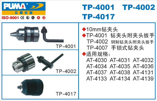 1.如阁下对TP-4001,TP-4002,TP-4017 10mm钻夹头价格和使用方法等有需求时,我们的客服人员将为阁下找到解决TP-4001,TP-4002,TP-4017 10mm钻夹头问题的方法。