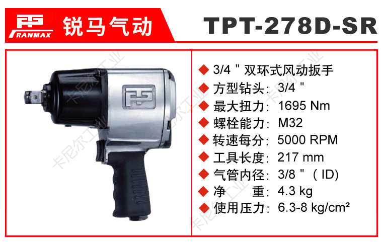 1.如阁下对TPT-278D-SR 台湾锐马3/4"风动扳手价格和使用方法等有需求时,我们的客服人员将为阁下找到解决TPT-278D-SR 台湾锐马3/4"风动扳手问题的方法。