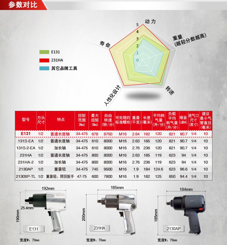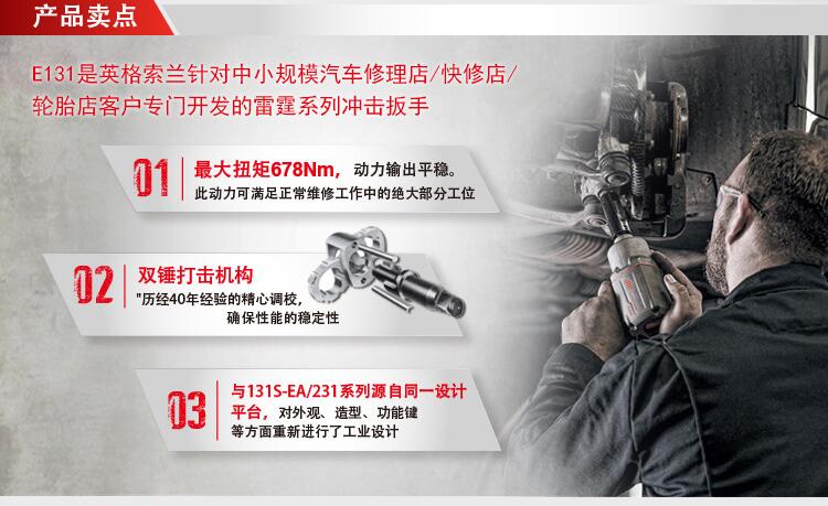E131与广受欢迎的131S-EA出自同一平台。产品设计采用英格索兰专利的打击机构lmpactoolTM,使用优良的零部件材料。先进的加工工艺和领先业内的装置水平以及一流的工业设计使用性能表现卓着。