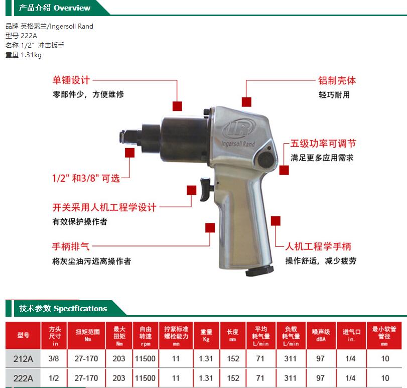 英格索兰气动冲击扳手222A是同类产品中最强劲的扳手,能轻松处理M8-M14的螺栓。超强的耐用性,即使严酷的工作环境,也一样能应付自如。