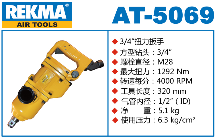 1.如阁下对REKMA AT-5069 锐克马气动扳手价格和使用方法等有需求时,我们的客服人员将为阁下找到解决REKMA AT-5069 锐克马气动扳手问题的方法。