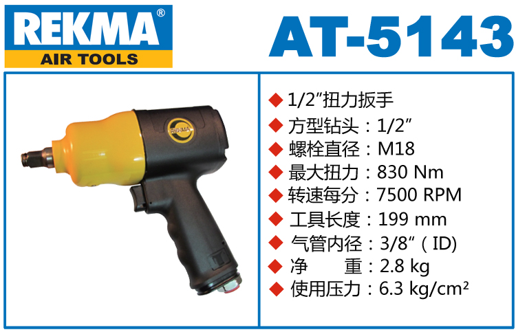 1.如阁下对REKMA AT-5143 锐克马气动扳手价格和使用方法等有需求时,我们的客服人员将为阁下找到解决REKMA AT-5143 锐克马气动扳手问题的方法。