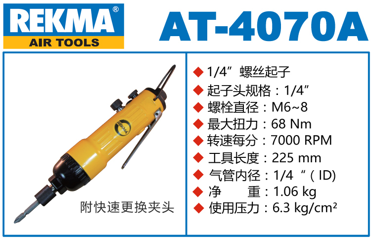 1.如阁下对REKMA AT-4070A 锐克马气动起子价格和使用方法等有需求时,我们的客服人员将为阁下找到解决REKMA AT-4070A 锐克马气动起子问题的方法。