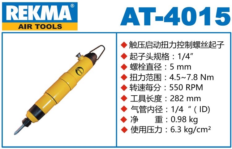 1.如阁下对REKMA AT-4015 锐克马气动起子价格和使用方法等有需求时,我们的客服人员将为阁下找到解决REKMA AT-4015 锐克马气动起子问题的方法。