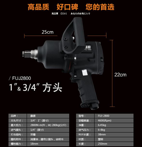 1.如阁下对日本藤原FUJ-2800 1寸3/4寸气动扳手强力小风炮价格和使用方法等有需求时,我们的客服人员将为阁下找到解决日本藤原FUJ-2800 1寸3/4寸气动扳手强力小风炮问题的方法。