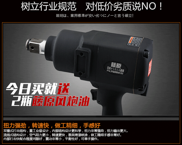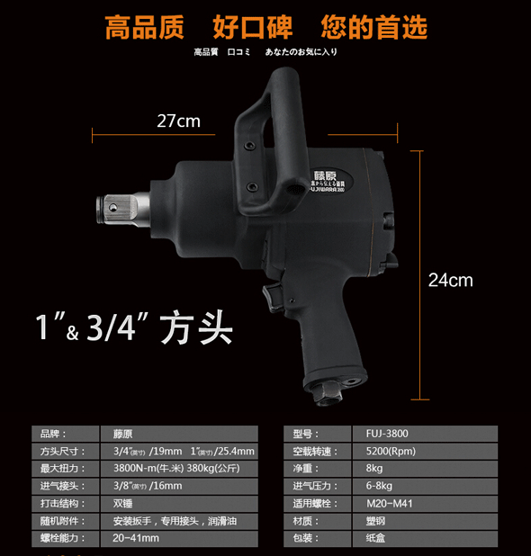 3.我们将对日本藤原FUJ-3800 1寸3/4寸车载重型风炮气动扳手提供免费送检,阁下在签收快递前请详细核查日本藤原FUJ-3800 1寸3/4寸车载重型风炮气动扳手资料信息。