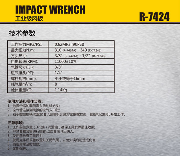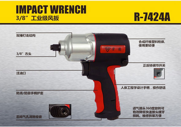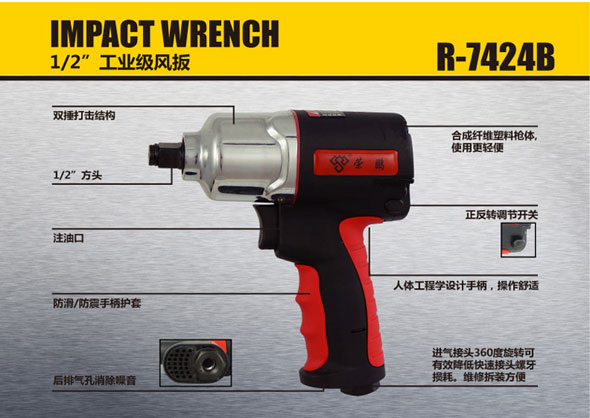 3.我们将对R-7424A/B荣鹏气动工具气动扳手提供免费送检,阁下在签收快递前请详细核查R-7424A/B荣鹏气动工具气动扳手资料信息。